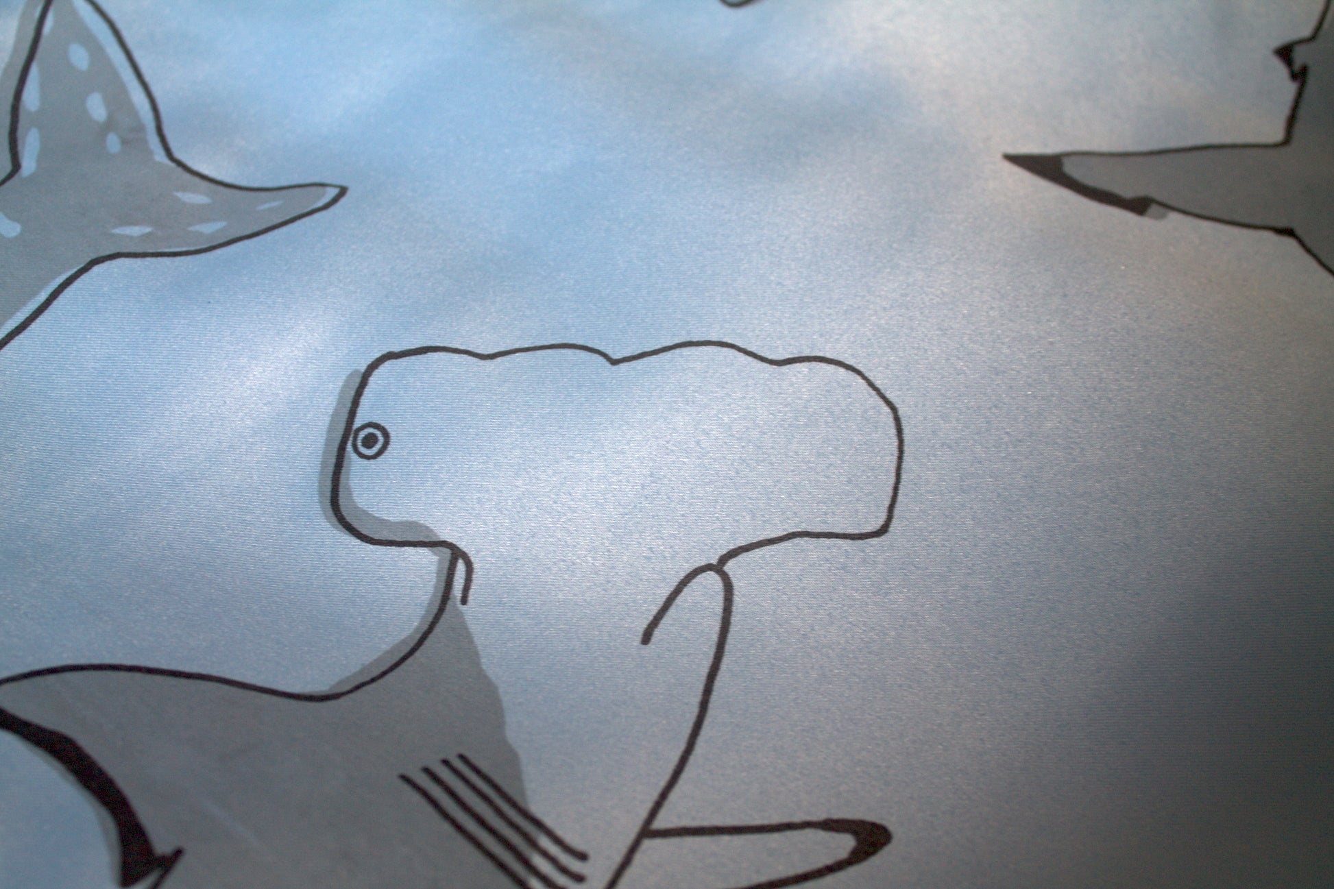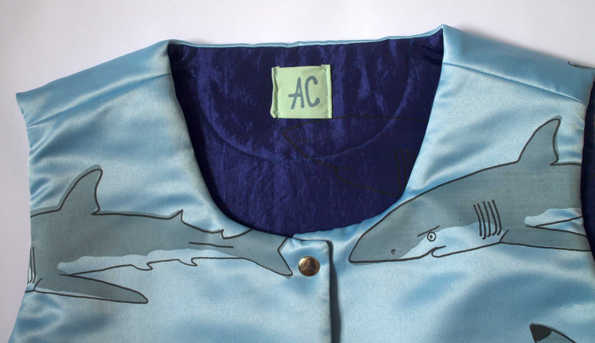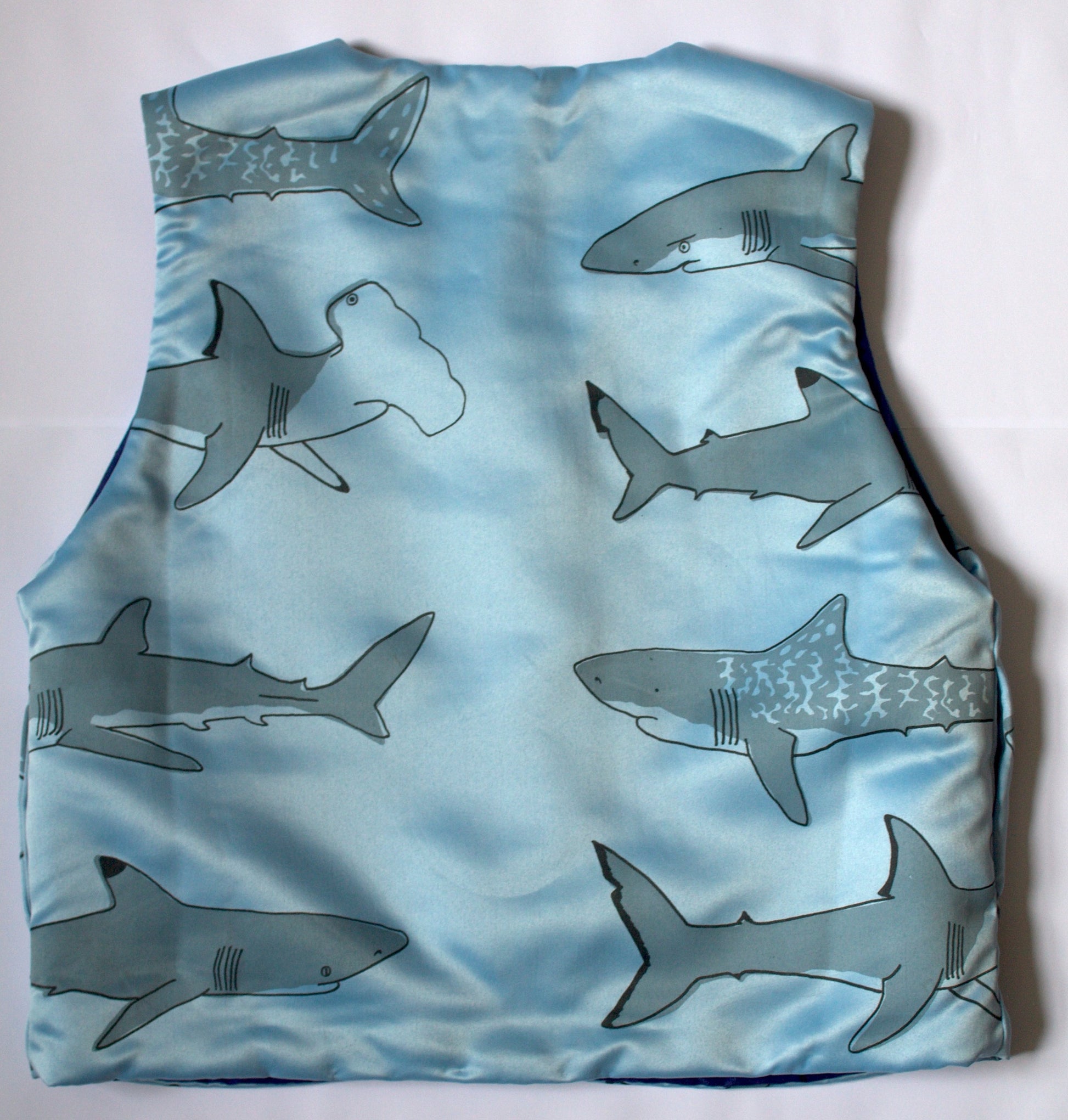 This fun shark printed bodywarmer is made using a piece of satin type fabric I picked up at a charity sale. The fabric is a light ice blue with a nice sheen to it. I have printed a mix of Tiger Sharks, Hammerhead Sharks, Black Tip Reef Shark and Blue Sharks in grey.