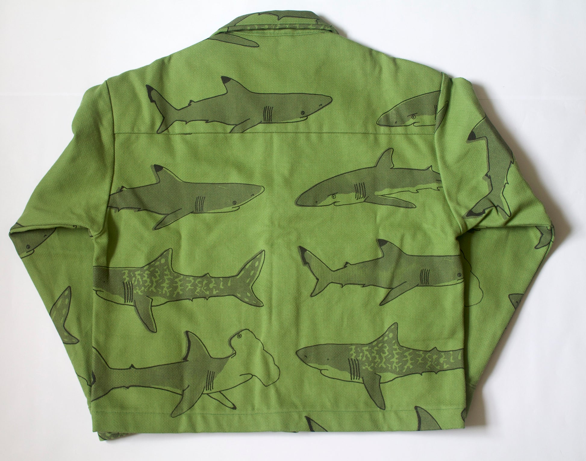 A green canvas jacket, with light grey shark print - unisex