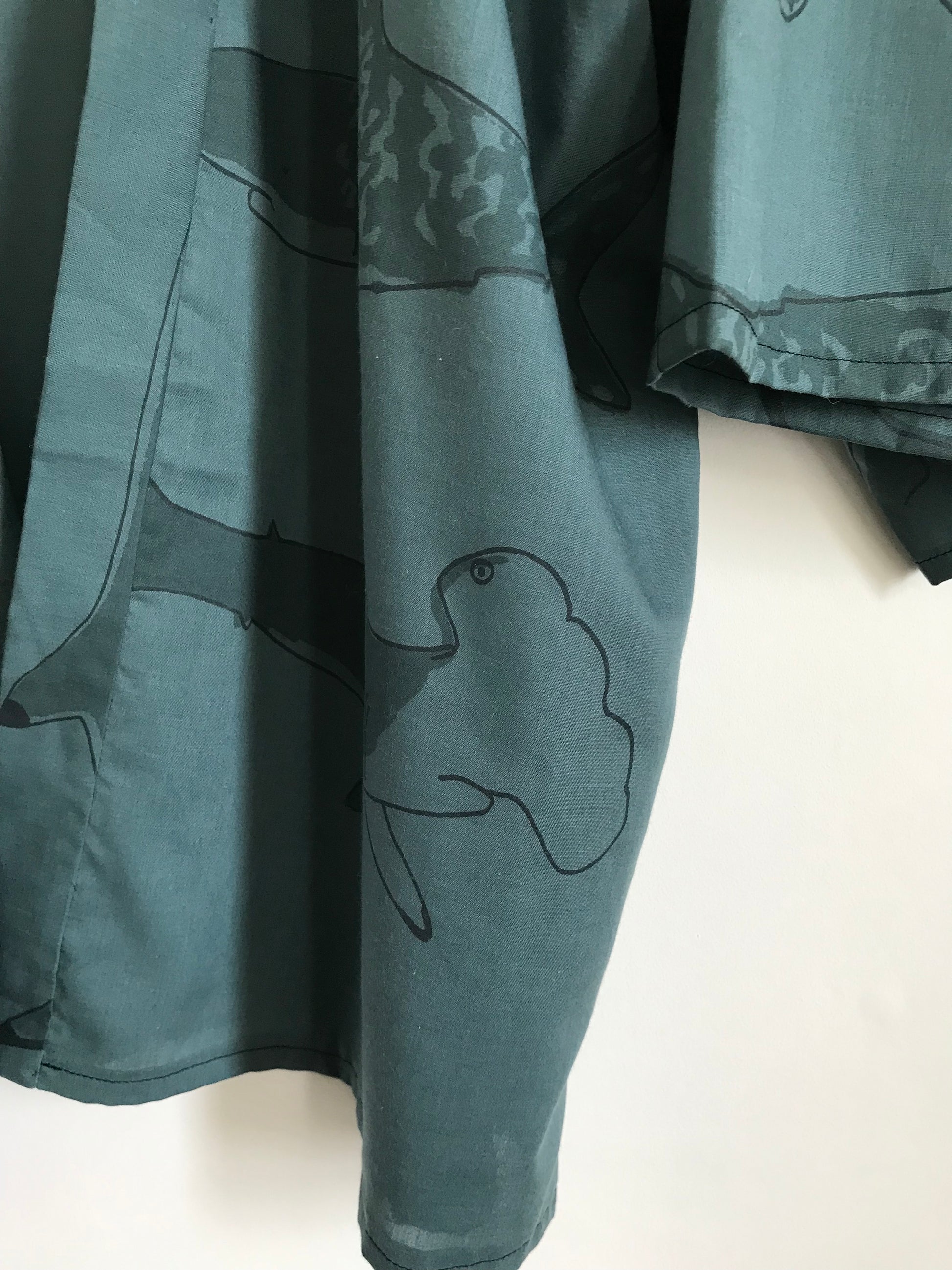 This housecoat is made from secondhand lightweight poly-cotton in a charcoal grey colour, the fabric is handprinted with a mix of sharks, including hammerhead sharks, tiger sharks, and black tip reef sharks.