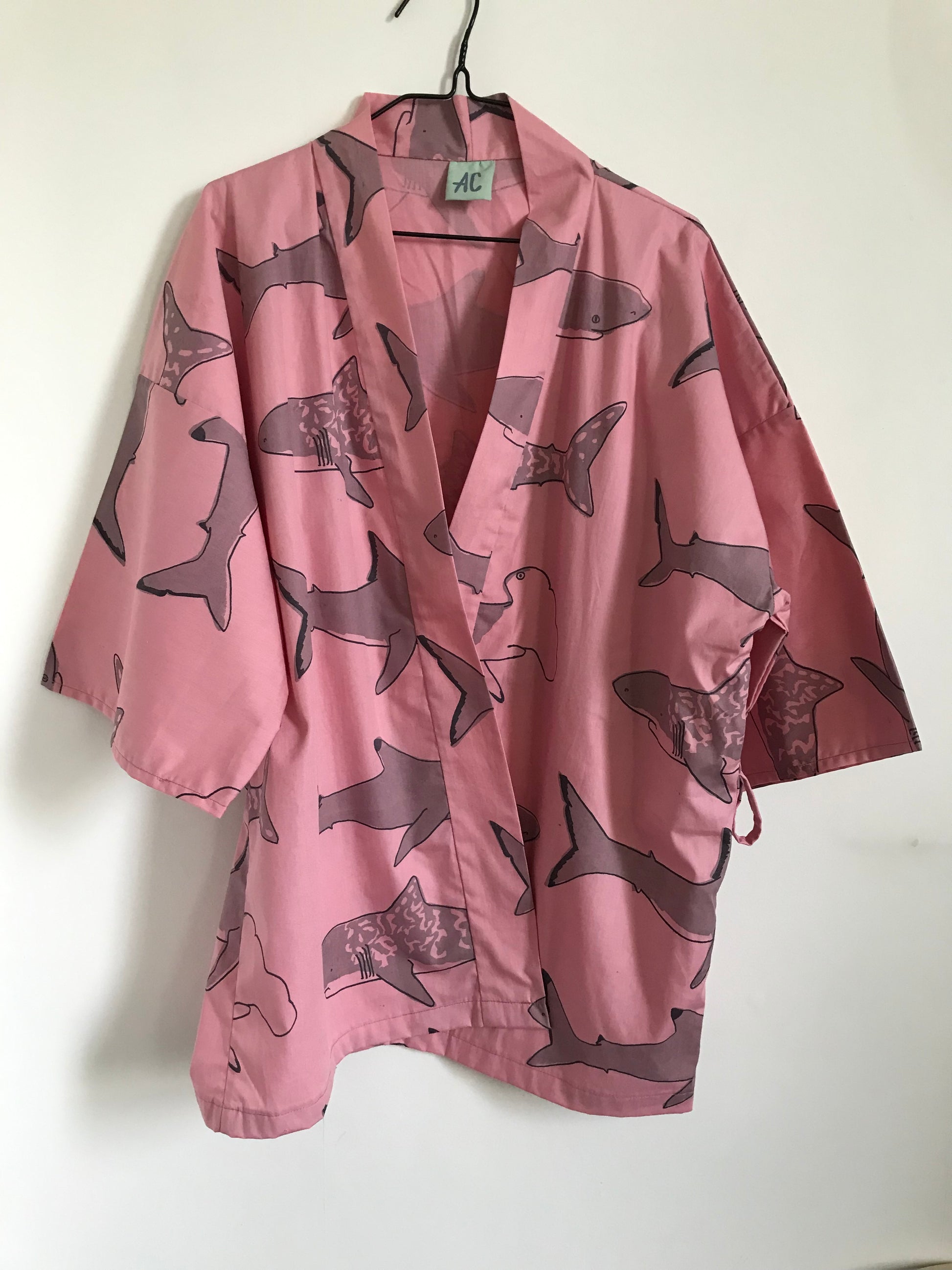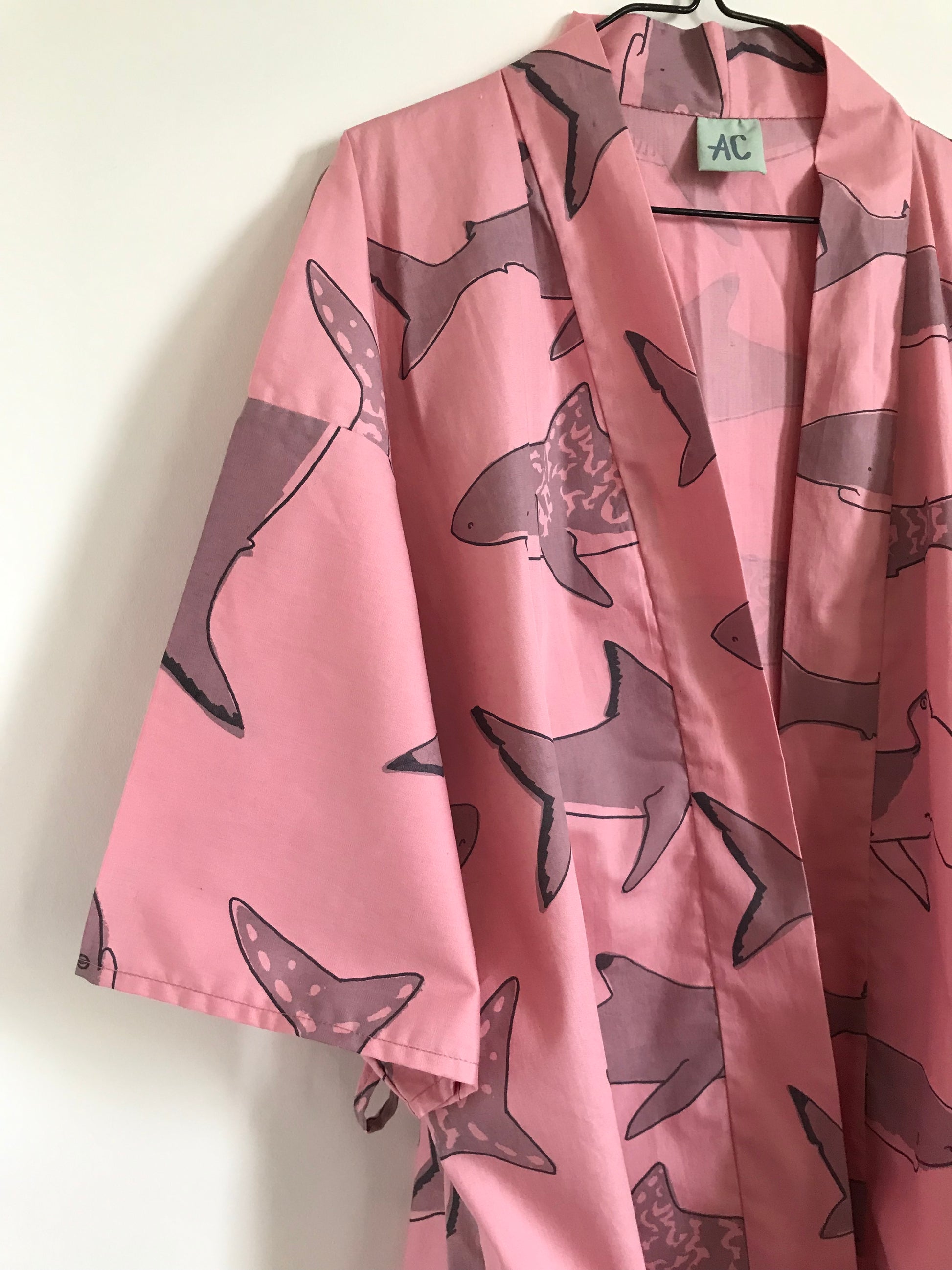 This coat is made from vintage cotton in a pale pink colour, the fabric is handprinted with a mix of grey sharks, including a hammerhead shark, a tiger shark, a black tip reef shark.