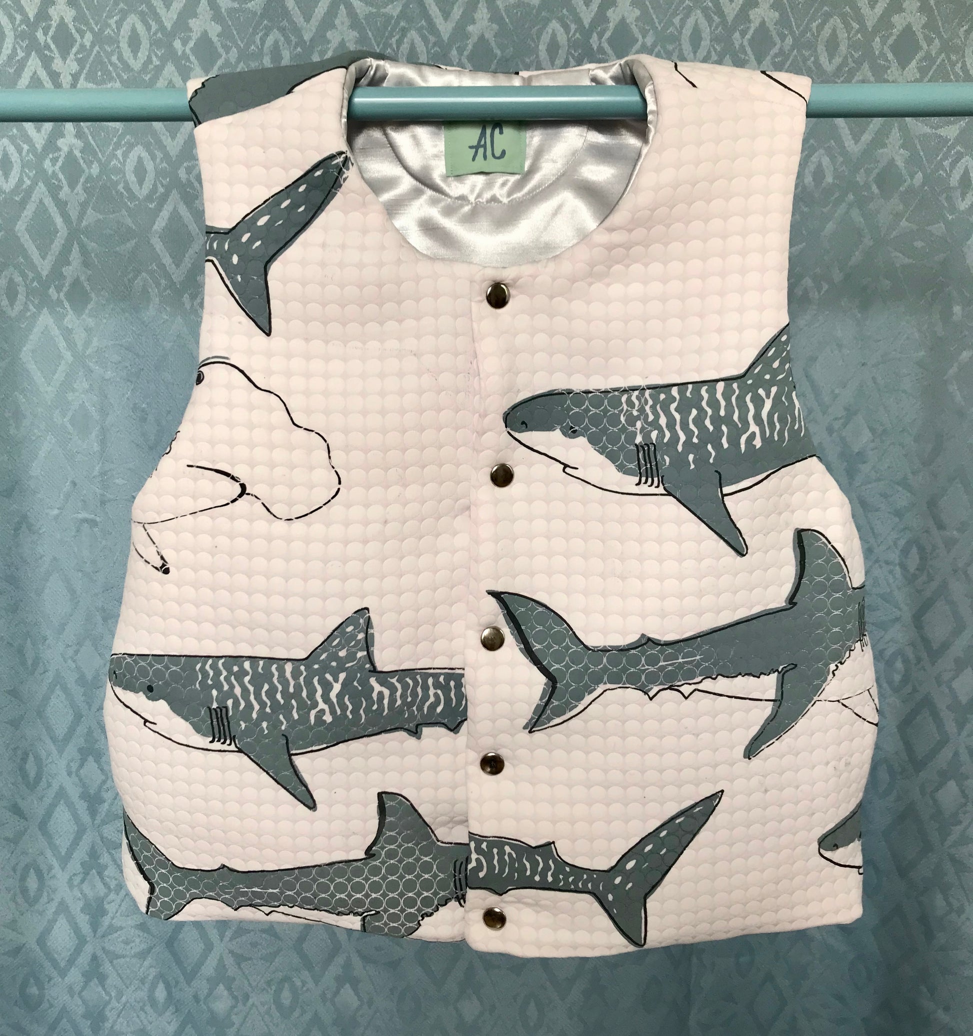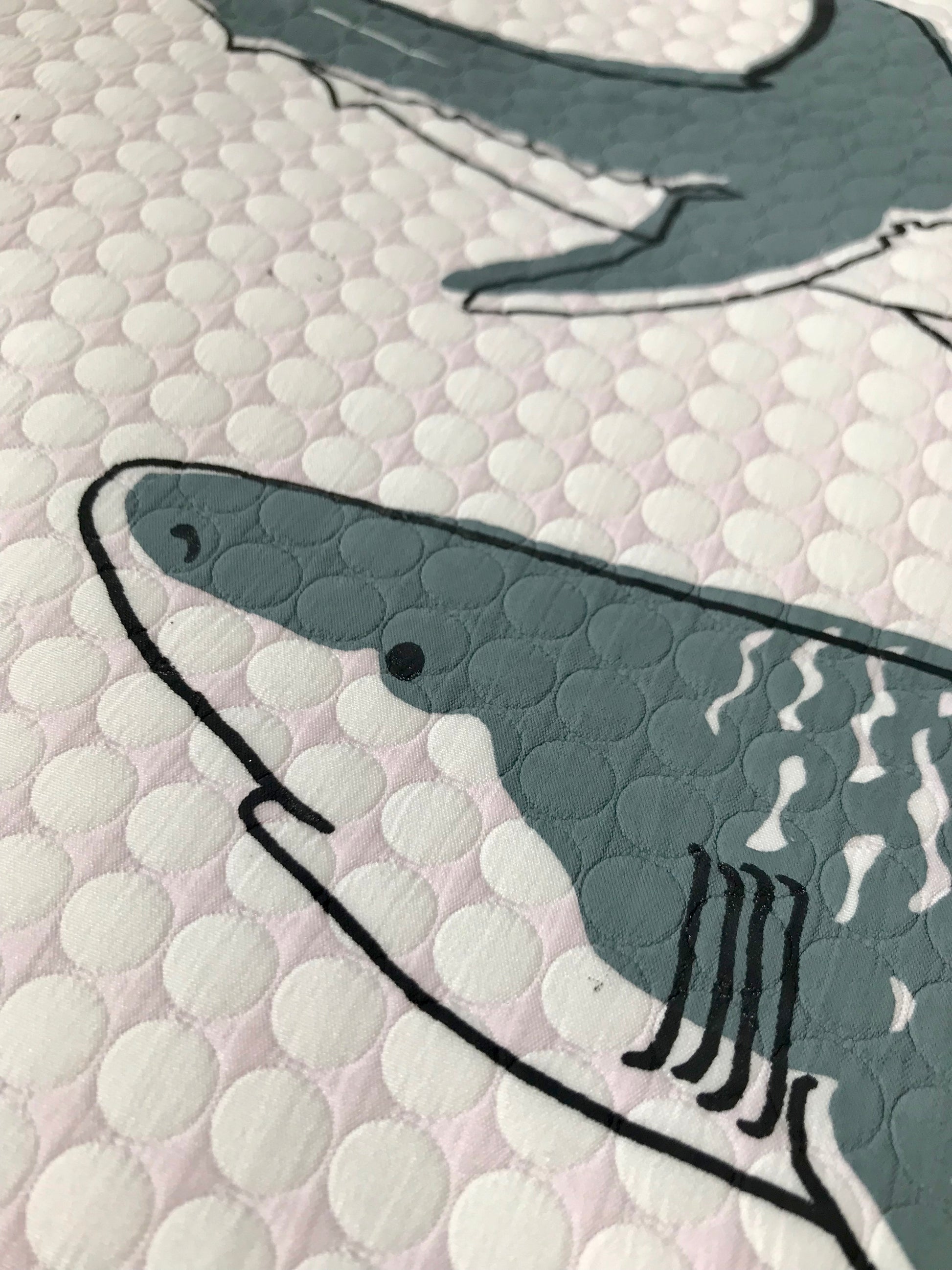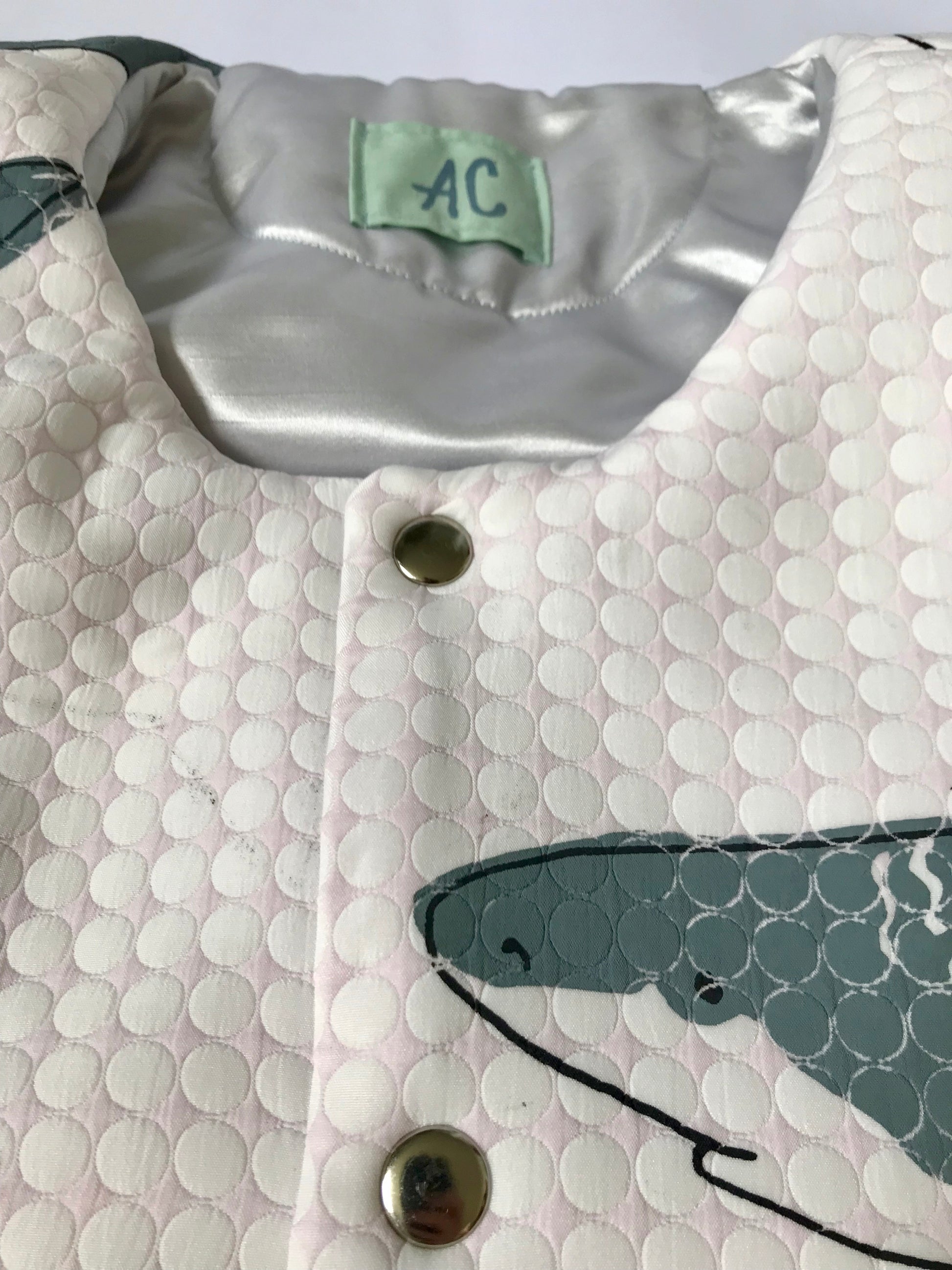 This fun shark printed bodywarmer is made using a piece of woven fabric I picked up at a charity sale. The fabric features a circles pattern- white circles on a pale pink background, it has a slight quilted texture. I have printed a mix of Tiger Sharks and Hammerhead Sharks in grey.