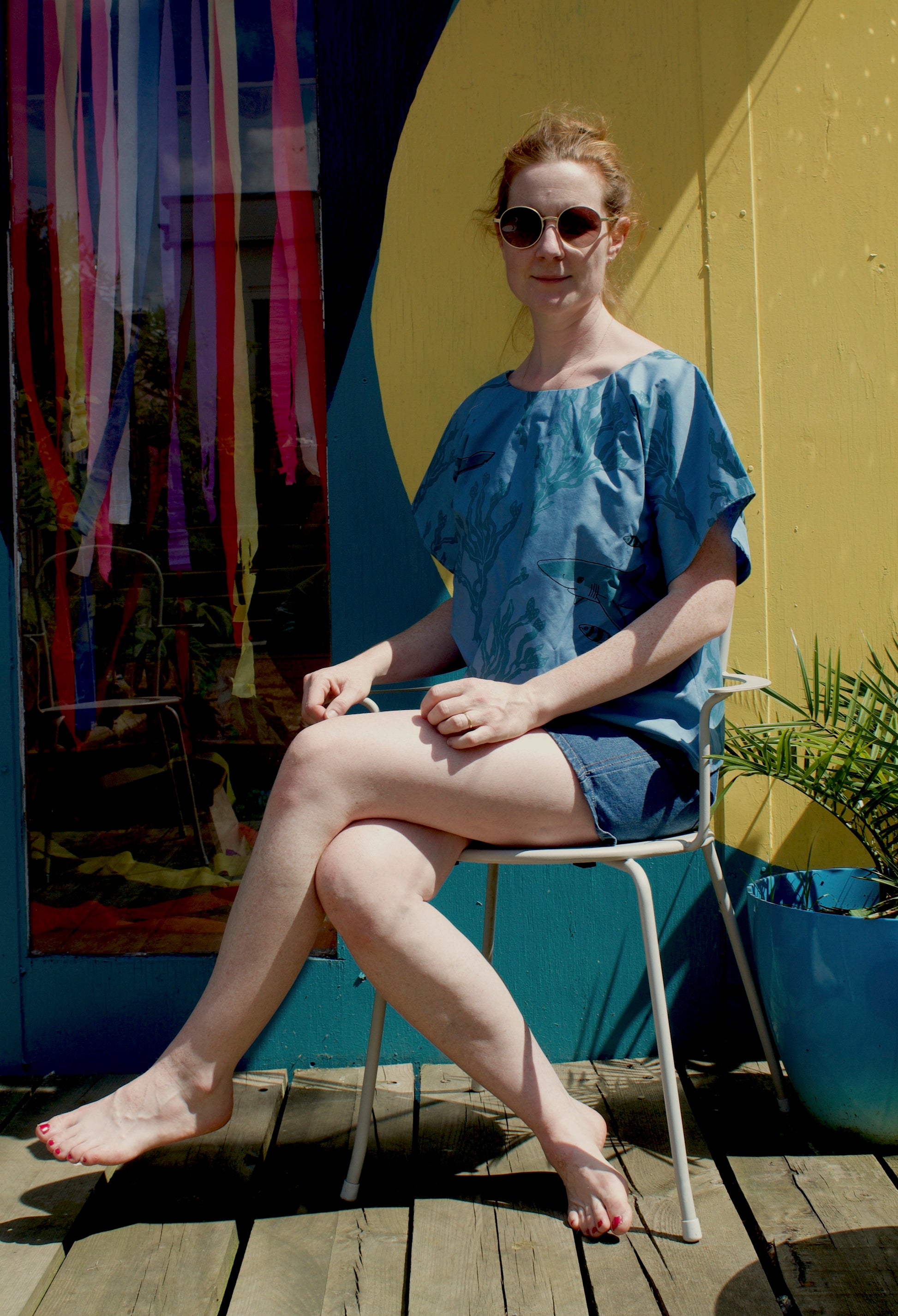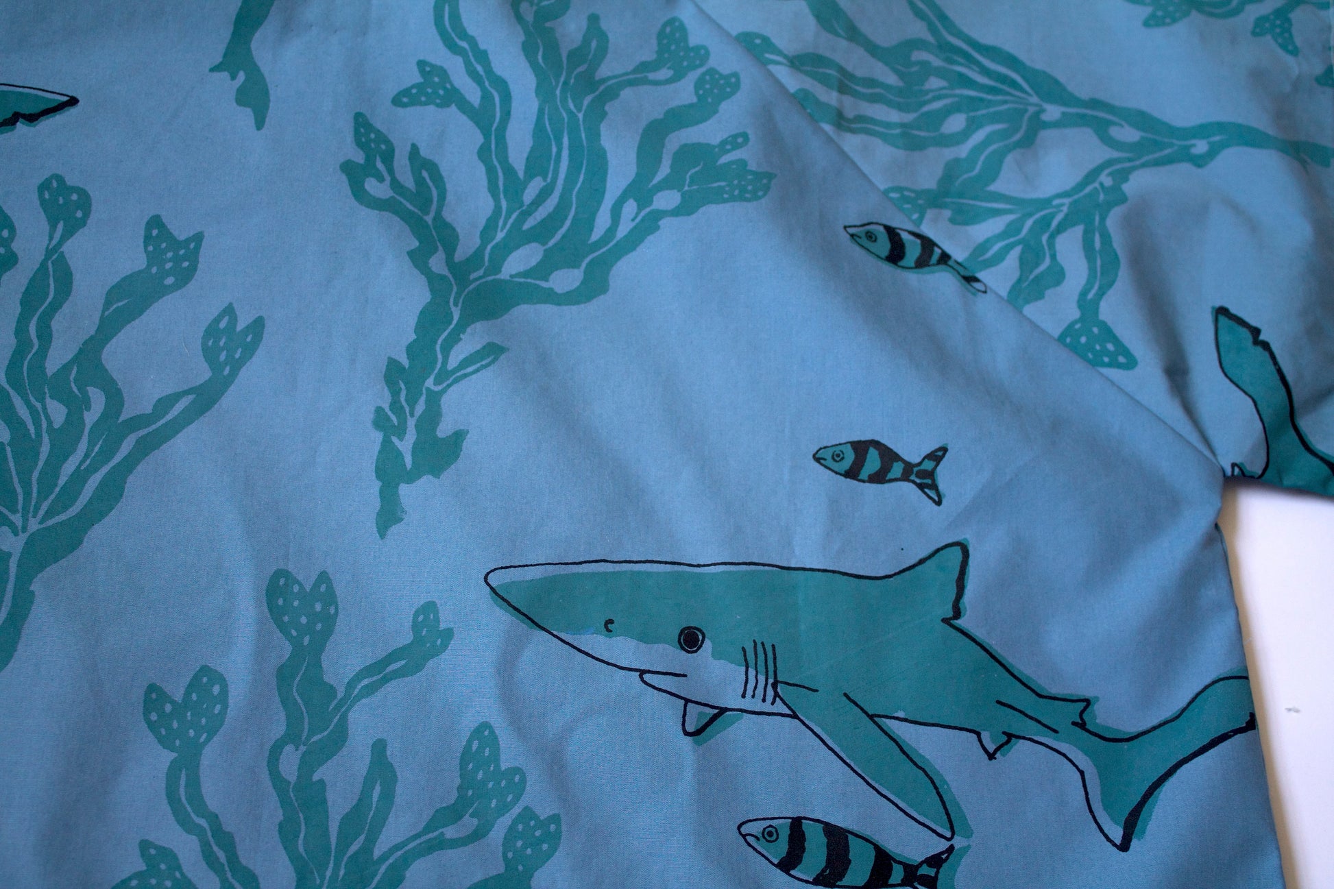 This t-shirt started life as a duvet cover. The fabric is a light blue cotton, printed with a green shark and seaweed design. Wear with the V at the back or the front!
