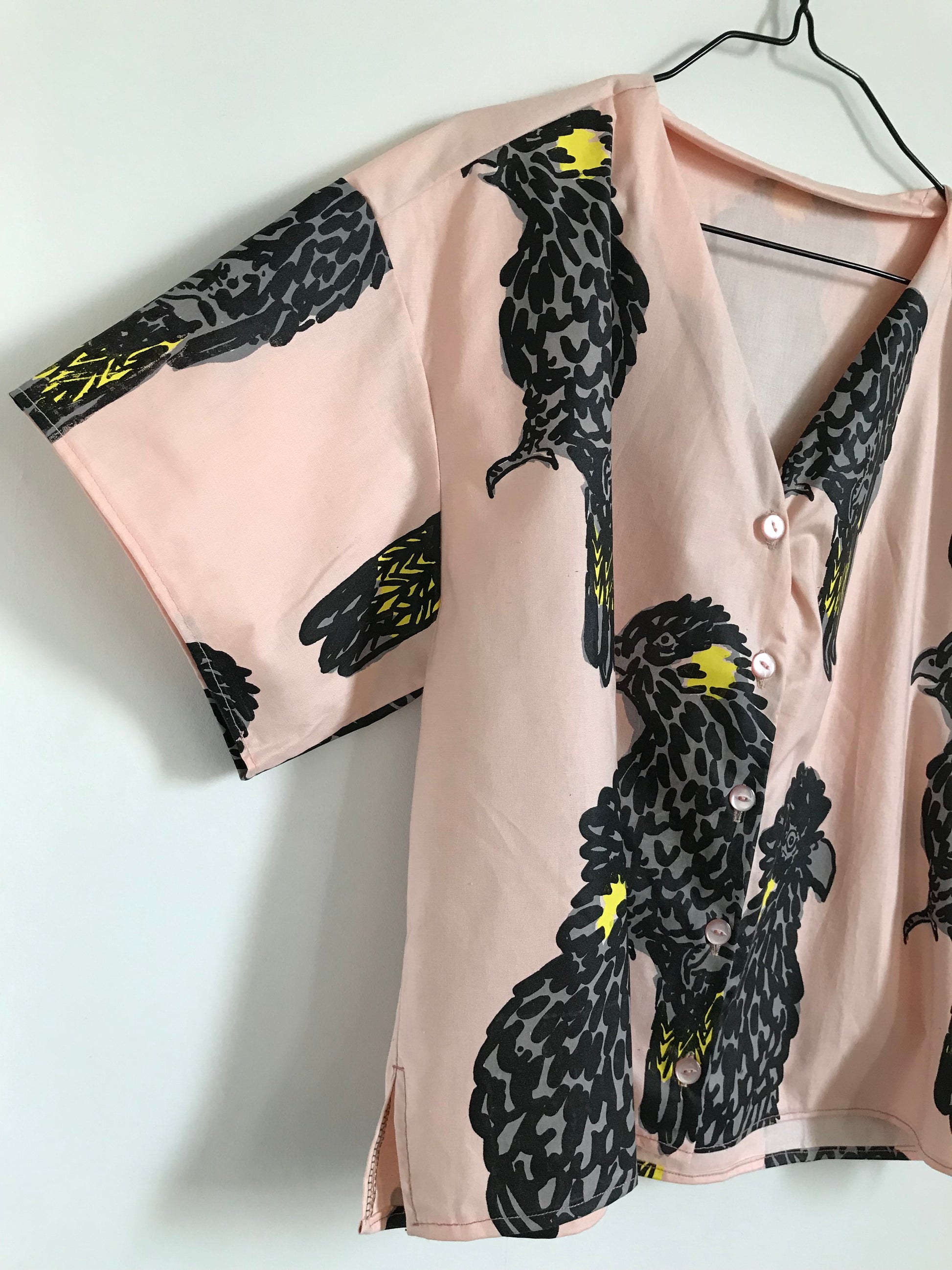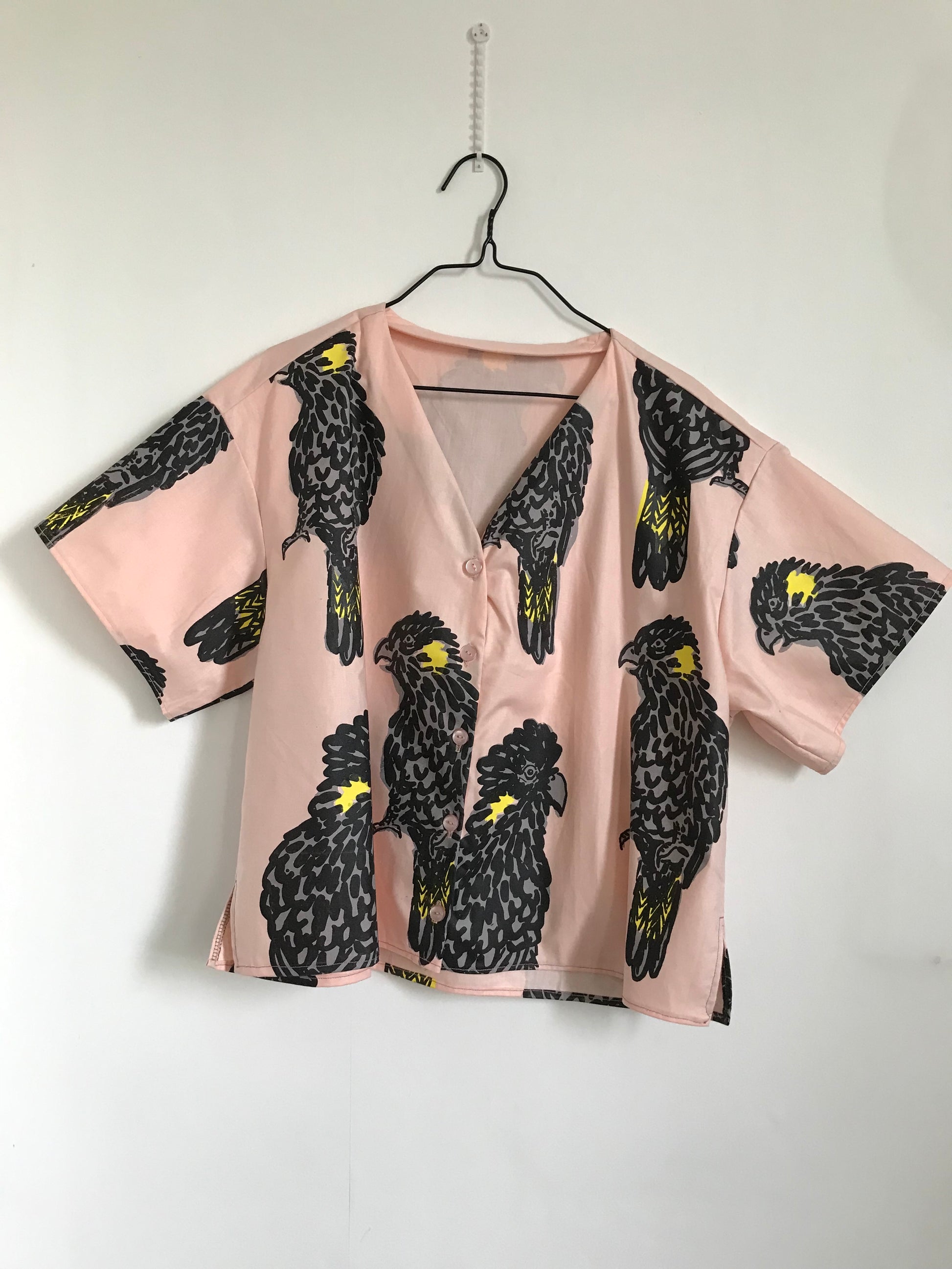 Take it easy in this stand-out short sleeved shirt. Featuring hand printed Yellow Tailed Black Cockatoos, and buttons from my vintage button collection.